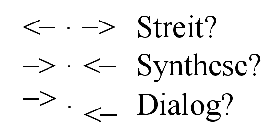 (PARMENIDES um 500 vor: Fragmente) Dialektik und GeometrieDenken und Sein ist dasselbe. Die gedachten Ideen können sich aber nur so zueinander verhalten, daß sie auch das Sein abbilden. Stellen Sie sich hierzu einen Gegensatz vor. Ein Gegensatz (Dualismus) erinnert doch an einen Streit. Wenn jedoch die Pfeile aufeinanderzeigten, könnten sie sich in einer Synthese verschmelzen. Und wenn sie aneinander vorbeizeigten, aber dennoch zueinanderfinden wollten (zwei Menschen unterhalten sich über dasselbe Thema), müsste der Raum schon irgendwie gekrümmt sein. ![]() Dialektik (im weiteren Sinne) umfasst also alle Möglichkeiten, wie sich Ideen (in einem Gespräch) zueinander verhalten können. Was fehlt, ist die Bezeichnung für etwas, was der Menge aller Mengen vergleichbar ist. Diese gibt es tatsächlich. Ein Blatt Papier, auf dem alle Mengen eingezeichnet sind, ist eine Landkarte. Geographen nennen dieses Strichgewirr 'Raummuster'. Sie sind in der Lage, die Striche als Formen zu interpretieren und rekonstruieren damit die Entstehung jeder Landschaft. Das Fremdwort für das Auslegen von Texten und Kunstwerken lautet 'Hermeneutik', das für die Entstehung von Gegenständen 'Genese'. (Mathematiker interessieren sich für wiederkehrende Strukturen, die sie künstlich zu erzeugen versuchen und für die Mächtigkeit des Kontinuums.) |