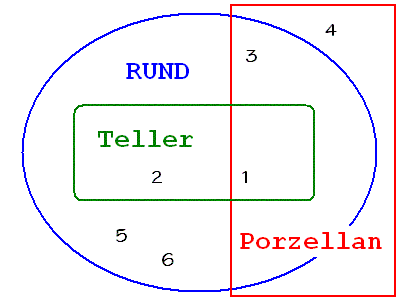 Es scheint zu klappen und zugleich auch nicht. Wir müssen schon sehr wohlwollend über die Spitzen hinwegsehen. Offensichtlich ist unsere Denkgrundlage zu einem guten Stück eine andere. Die Einführung von mehr als zwei Wahrheitswerten ist möglich, führt aber dann zu sehr viel mehr Kombinationen und löst unser Zufriedenheitsproblem genauso wenig. SyllogismenSyllogismen sind ebenfalls 'wenn ... dann'-Schlußfolgerungen. Ihre Besonderheit liegt darin, daß die beiden Ideen jeweils aus zwei Angaben bestehen, wovon eine der Angaben in beiden Ideen vorkommen muss. Frage: Wenn alle Teller rund sind und einige Teller aus Porzellan, dann ...? ![]() Lösung: